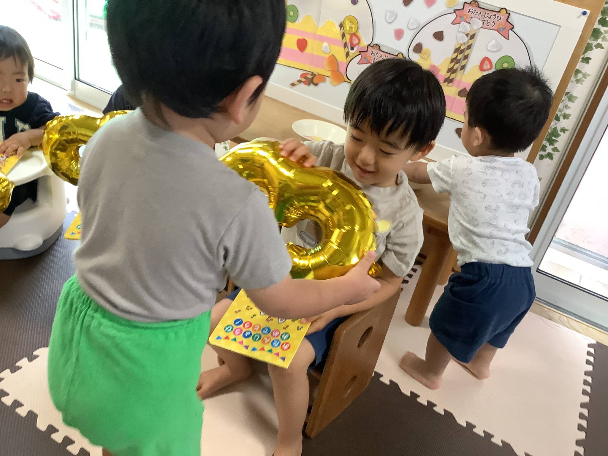お誕生日カードと風船のプレゼントをお友だちから手渡してもらうと