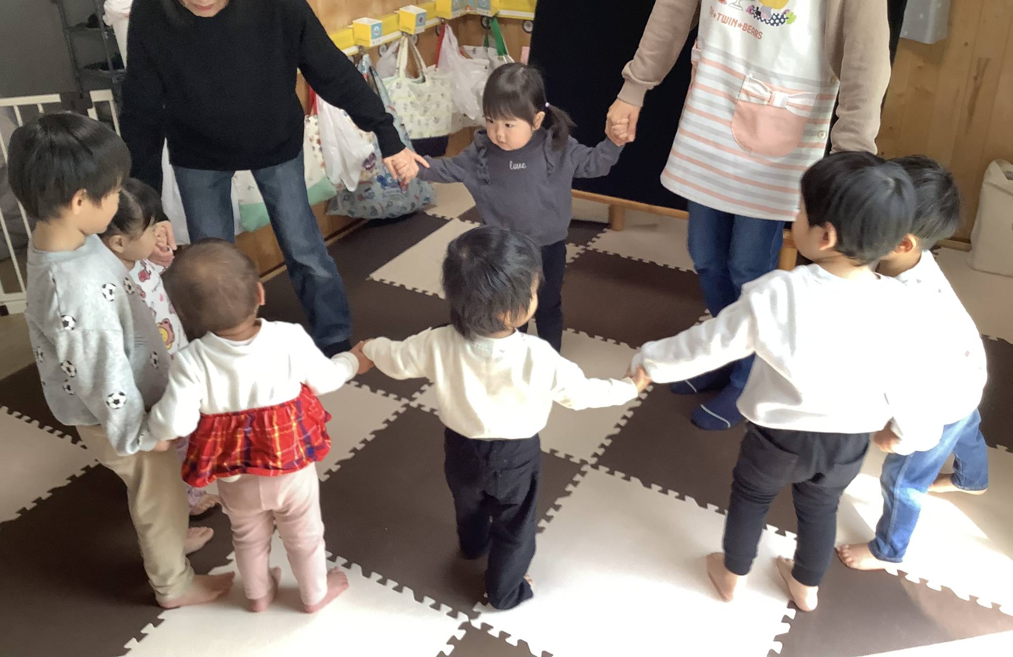 「あめこんこん」を唱えながらみんなで手を繋いで丸くなったり