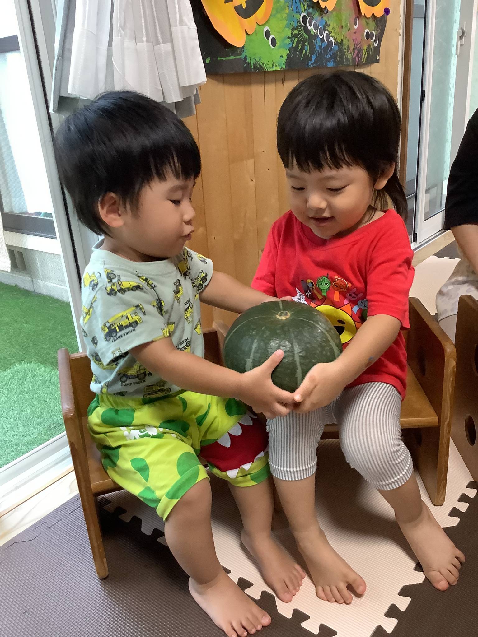 前回のおはなし会でも登場したかぼちゃが風呂敷きから出てくると